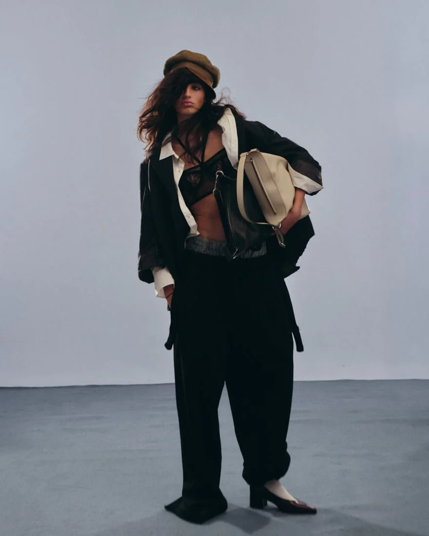 Mariana wears a blazer by DEAD COUTURE ICONS ANARCHIVE, a shirt by TOMMY HILFIGER, a bra by DOLCE&GABBANA, pants by RANDOM IDENTITIES by Stefano Pilati, shoes by FRAU, bags by TOD’S and a hat by STETSON