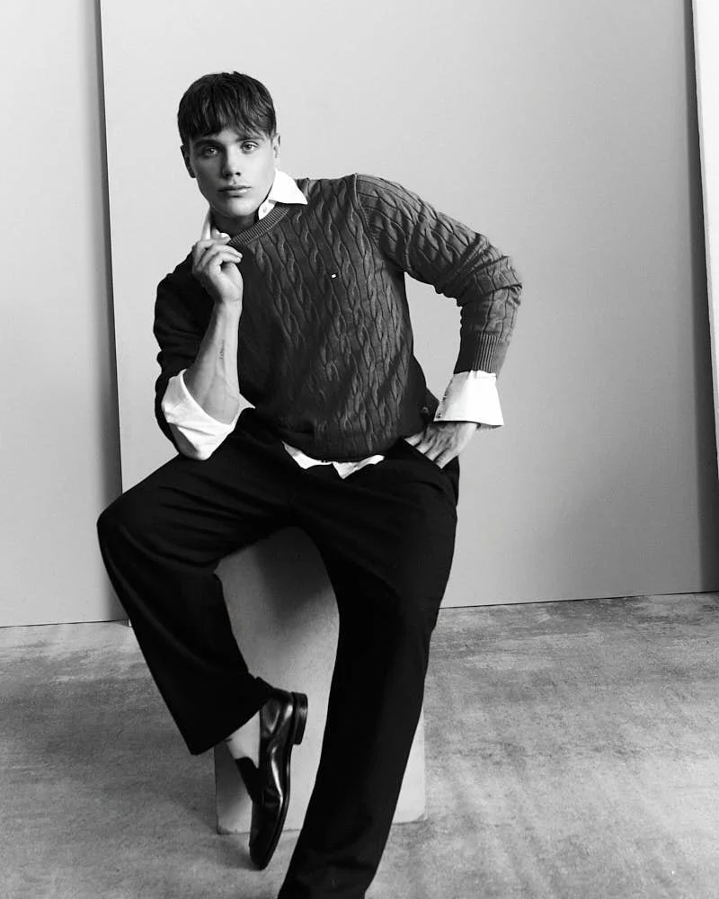 Stefano wears a sweater and shirt by TOMMY HILFIGER, pants by GIORGIO ARMANI, and shoes by CHURCH’S