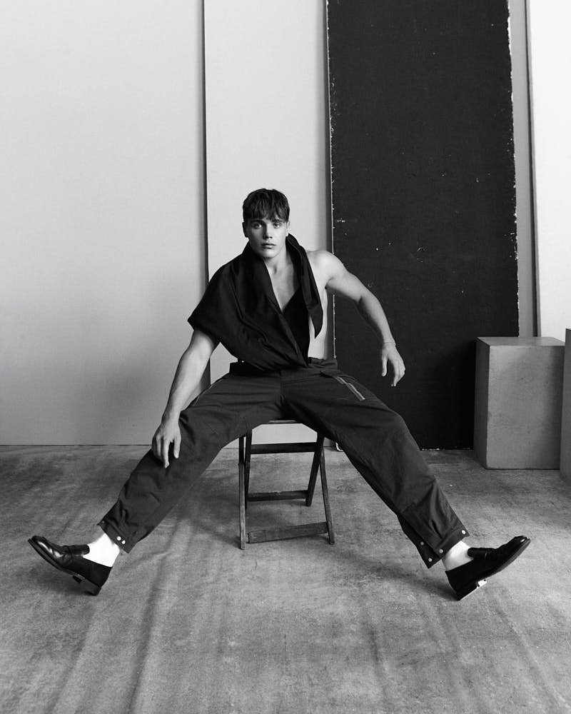 Dylan wears a blazer by GIORGIO ARMANI, a shirt by ISSEY MIYAKE, and pants by TELA