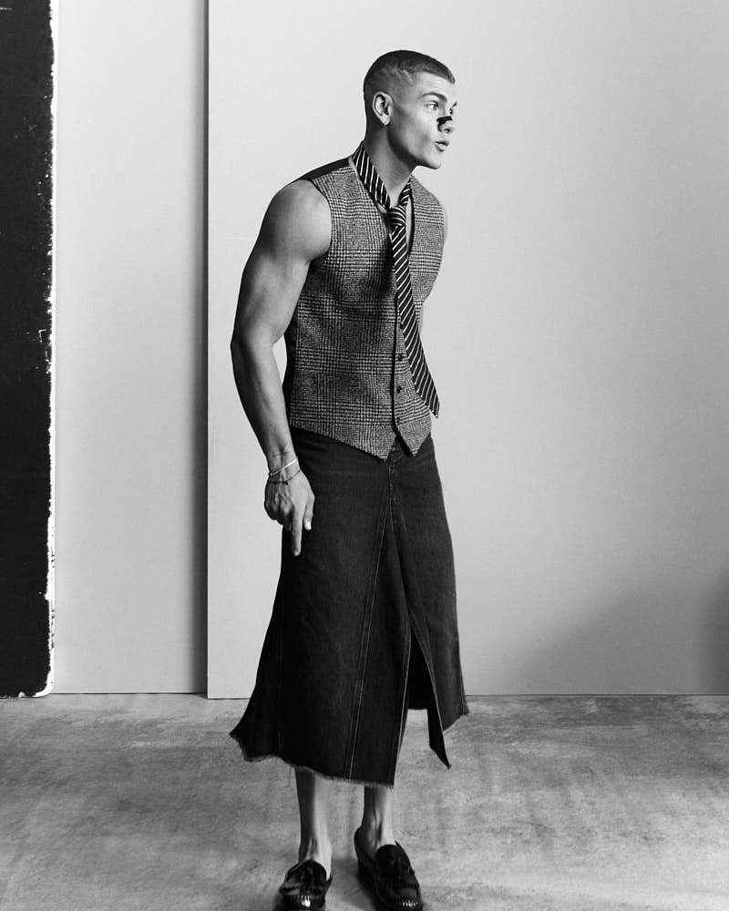 Filippo wears a vest by DOLCE&GABBANA, a skirt by HAIKURE, shoes by SEBAGO, and a tie from the ARCHIVE