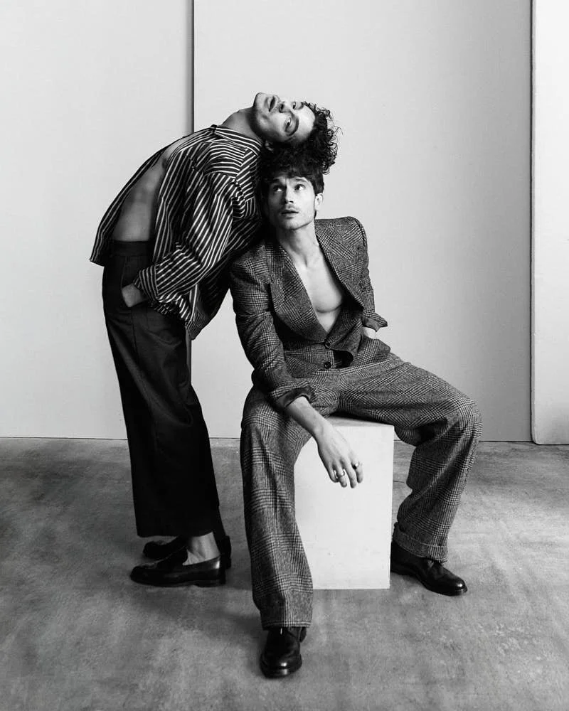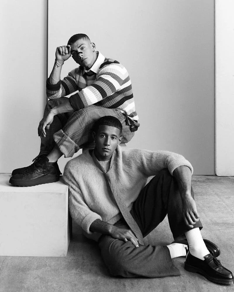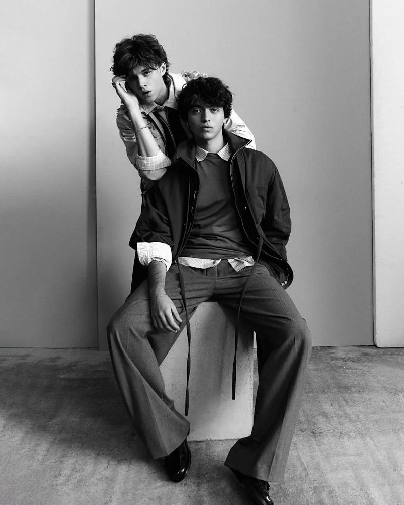 Filippo wears a sweater by DRUMOHR, a shirt by TOMMY HILFIGER, pants by GIORGIO ARMANI, and shoes by BEPOSITIVE. Dylan wears a sweater and pants by PHYSIQUE DU ROLE, shoes by DR MARTENS, and a tie by PAUL SMITH.