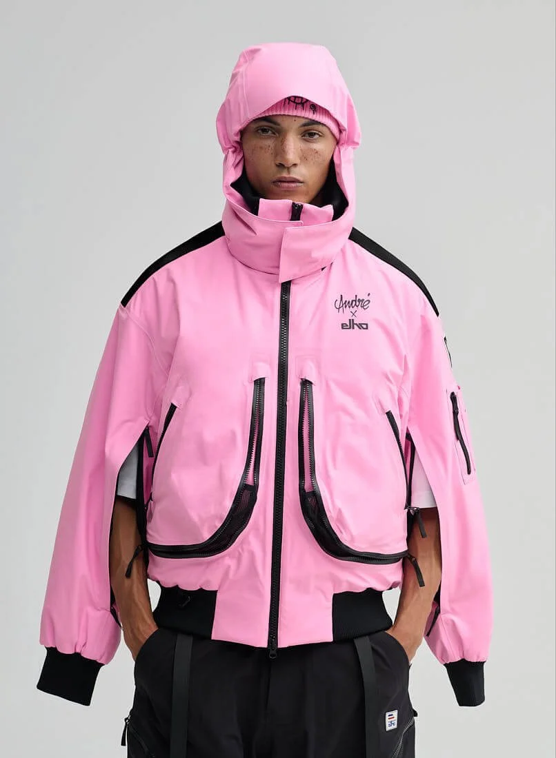 The André x ELHO collection stands in that place. No need for nostalgia, no need for comparison. Just jackets, pink, painted, sprayed live, turned into unique art pieces, worn with jeans, boots, skis strapped, mountains dropping. “I love the neon pink winter jacket with the black Mr. A on the back. It combines my two favorite things: Mr. A and pink.”